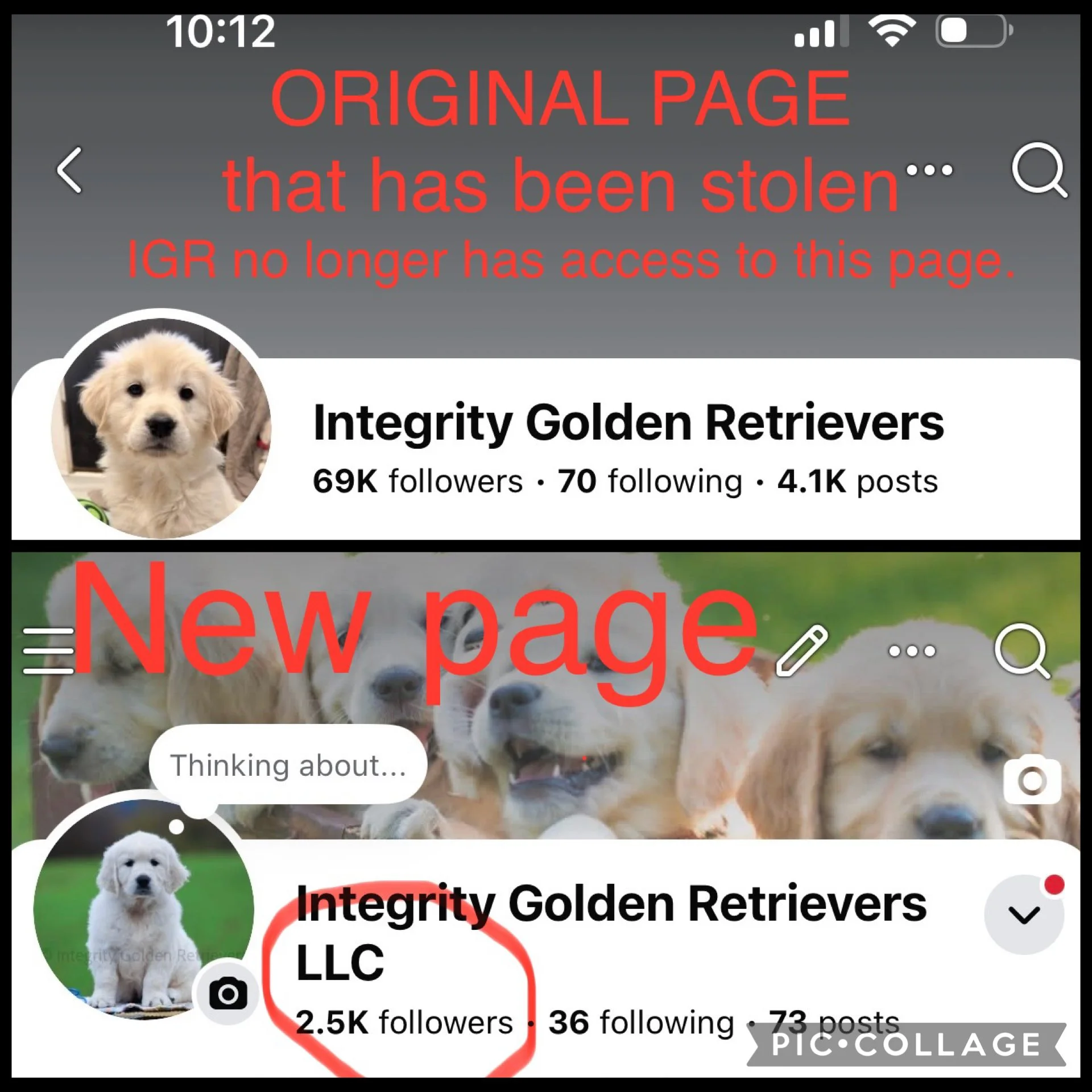 IGR is currently dealing with a situation on their original Facebook page (Integrity Golden Retrievers). The page has been stolen via a phishing scam and Christine has lost complete control and access.