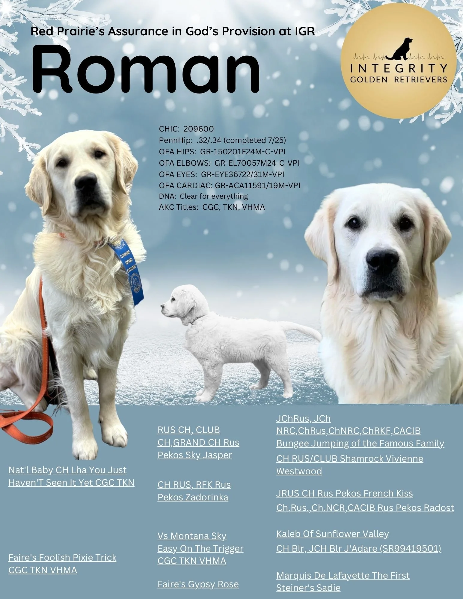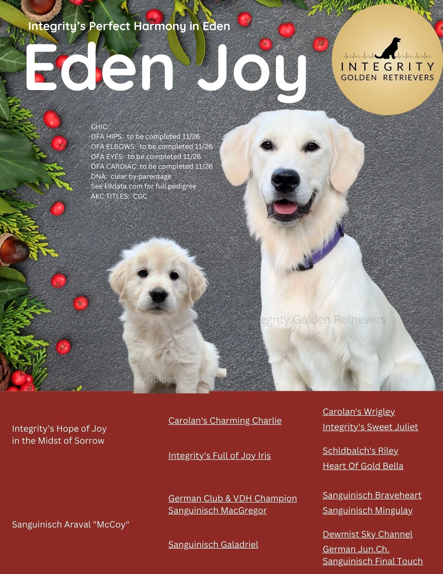 Eden is an Ellie daughter and a Juliet great-granddaughter. She is the 4th generation of goldens to be producing pups for IGR. Eden will turn two in late October 2026, and when she passes her final health clearances in November, she’ll be bred to Roman on her next heat cycle. It will be a litter of white/light creme pups. Any pup from this litter would be an excellent choice for a therapy/comfort dog.