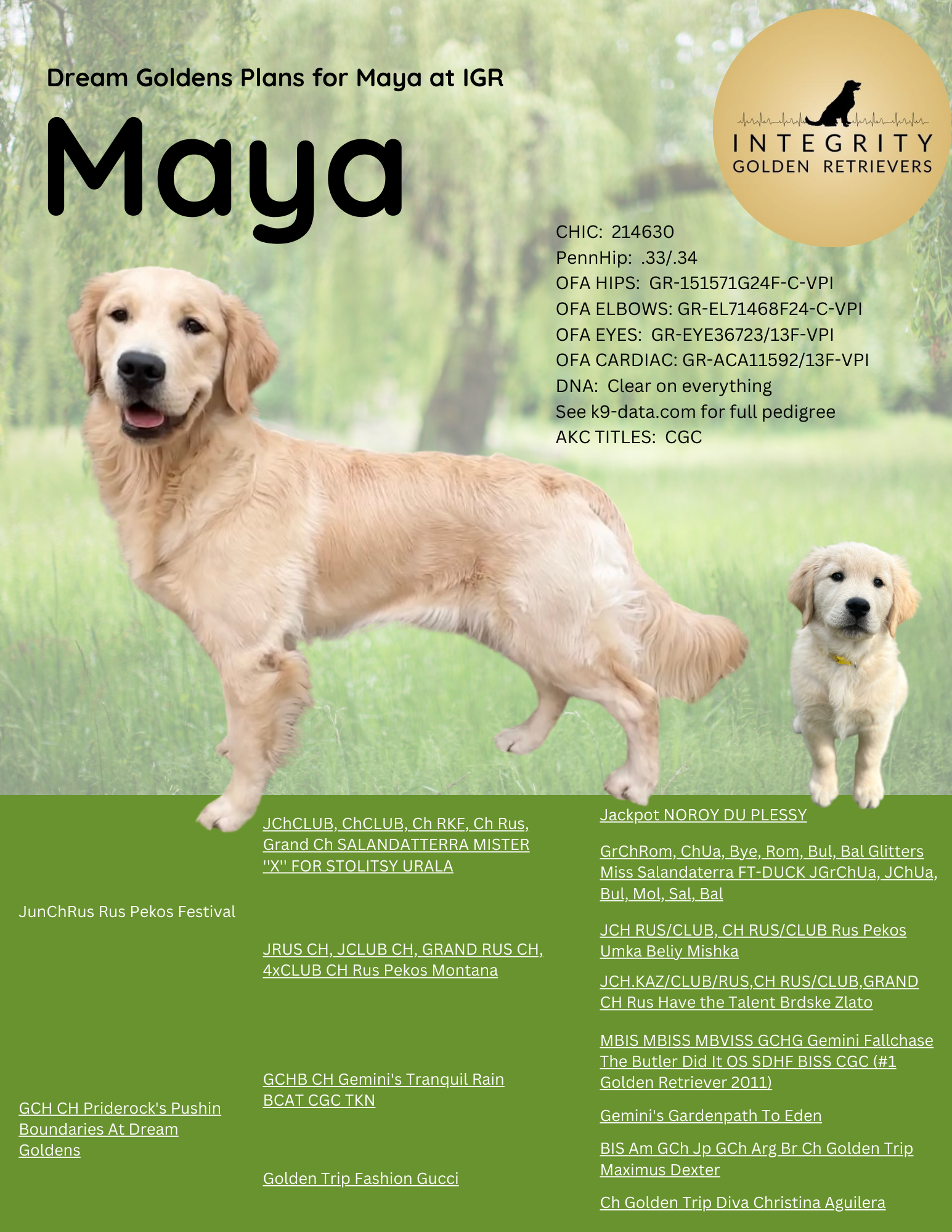 It’s hopeful that Maya passes all her final clearances when she turns two. Maya will be two in late December 2025. Once she passes their clearances, she’ll be paired with Roman for their first litter in June-ish 2026, which puts pups going home August-ish. Both Maya and Roman have earned their Canine Good Citizen title. Any pup from this litter would be an excellent choice for a therapy/comfort dog.